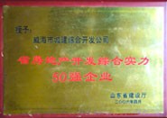 獲獎名稱:省房地產開發綜合實力50強企業 獲獎單位:威海市城建綜合開發公司 授獎單位:山東省建設廳