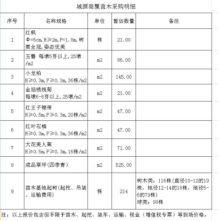 (4)采購內容:城源商廈項目綠化苗木的采購及苗木基地樹苗的起挖、裝車并運輸?shù)焦さ刂付ǖ攸c,采購清單詳見附件。