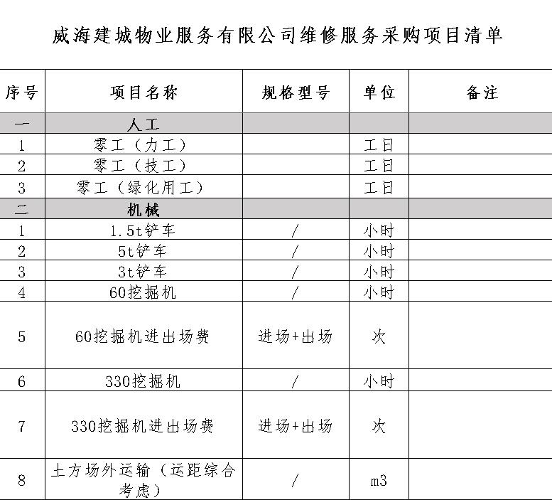 (5)采購內容:威海建城物業服務有限公司涉及零星工程及防水補漏等所有維修工作,包工包料,具體清單詳見附件。